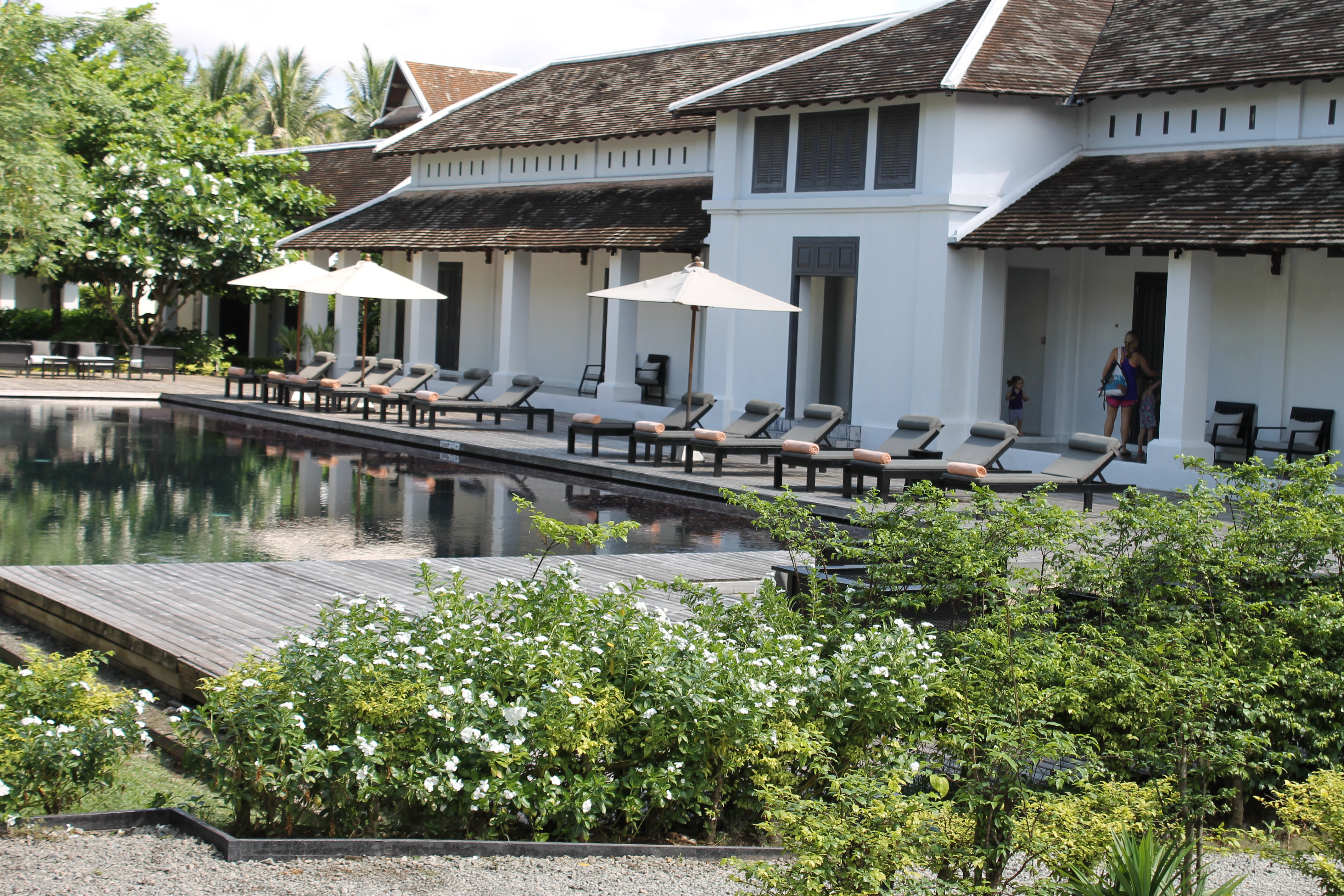 This time, we opted for a hotel with a pool (it’s HOT in Laos in April). In Luang Prabang, this means you have to stay a bit outside of town, as pools aren’t permitted in the historic district. We stayed at Hotel de La Paix, a boutique hotel managed by Accor (soon to become a Sofitel property). A fabulous decision, it turns out. Thanks to our Accor Advantage Plus card, they upgraded us to a large, open poolside room, complete with a huge bathroom, an outdoor garden with lounge chairs, a stocked (complimentary) mini bar, an iPod with local music, and a ridiculously comfortable bed.